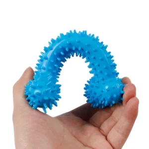 A strong and textured circle-shaped chew toy for the purpose of preventing boredom and maintaining healthy chewing behaviors in dogs. Easy to handle and fun to chew on.