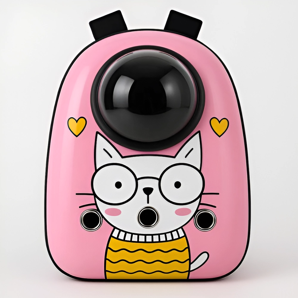 A cute, durable pink cat-themed pet carrier backpack featuring a bubble window, breathable ventilation, and padded straps is ideal for comfortably and stylishly carrying cats and small dogs during travel and outings.