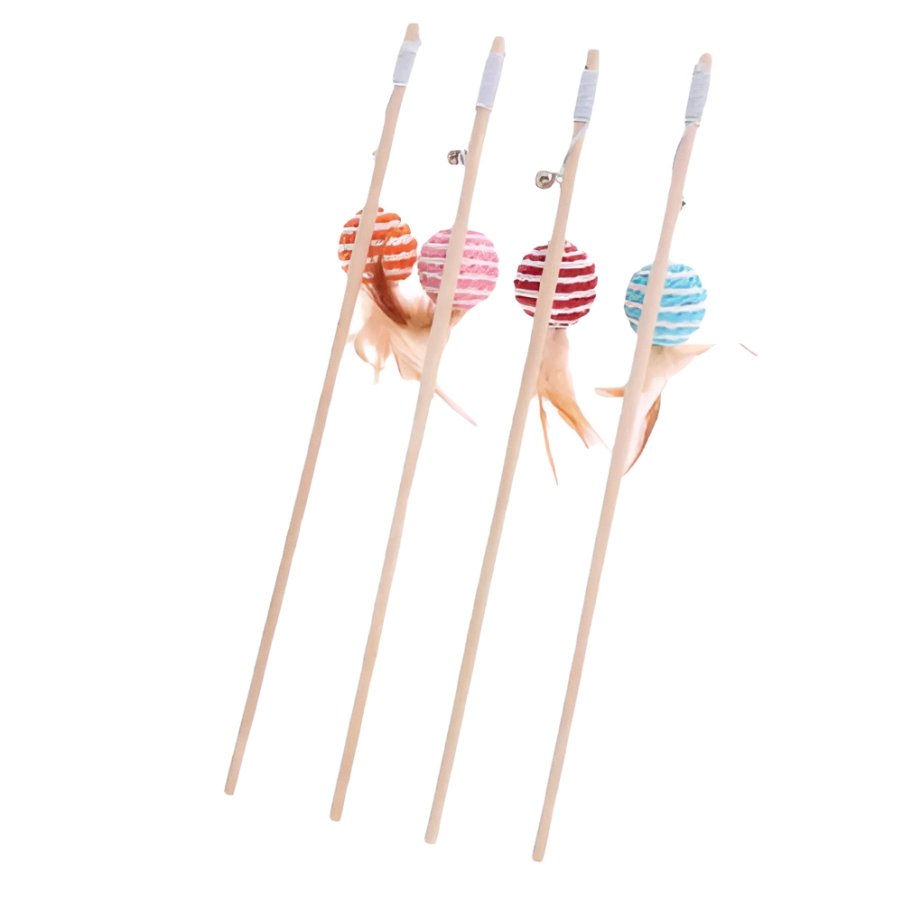 Wooden Cat Play Wand with Bell, Feathers & Rope Ball Toy